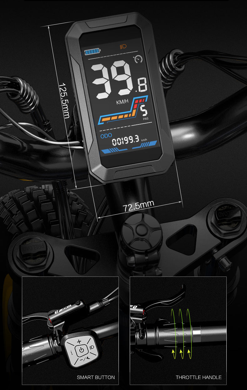 Pantalla multifunción: equipada con una pantalla LCD inteligente, para que pueda verificar los datos de conducción de manera más conveniente, como la velocidad, el nivel de la batería, el odómetro, etc., también puede cambiar el nivel de asistencia del pedal según las condiciones de la carretera.